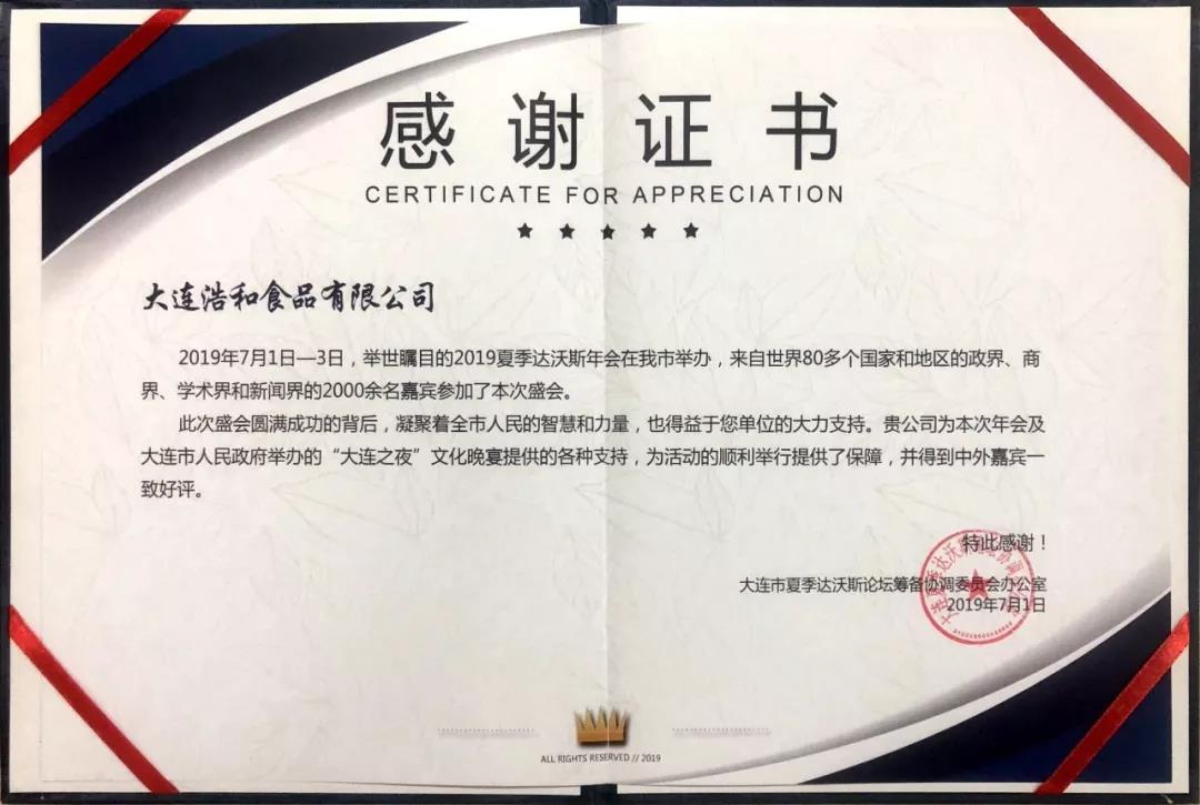 7月1日當(dāng)晚,大連夏季達沃斯籌備協(xié)調(diào)委員會向所有為保障此次文化晚宴順利圓滿進行而辛苦付出和認真籌備的餐飲企業(yè)及贊助企業(yè)表示衷心的感謝,并向相關(guān)企業(yè)頒發(fā)感謝證書,浩和作為此次達沃斯文化晚宴的優(yōu)秀服務(wù)商和供應(yīng)商,應(yīng)邀上臺領(lǐng)獎。