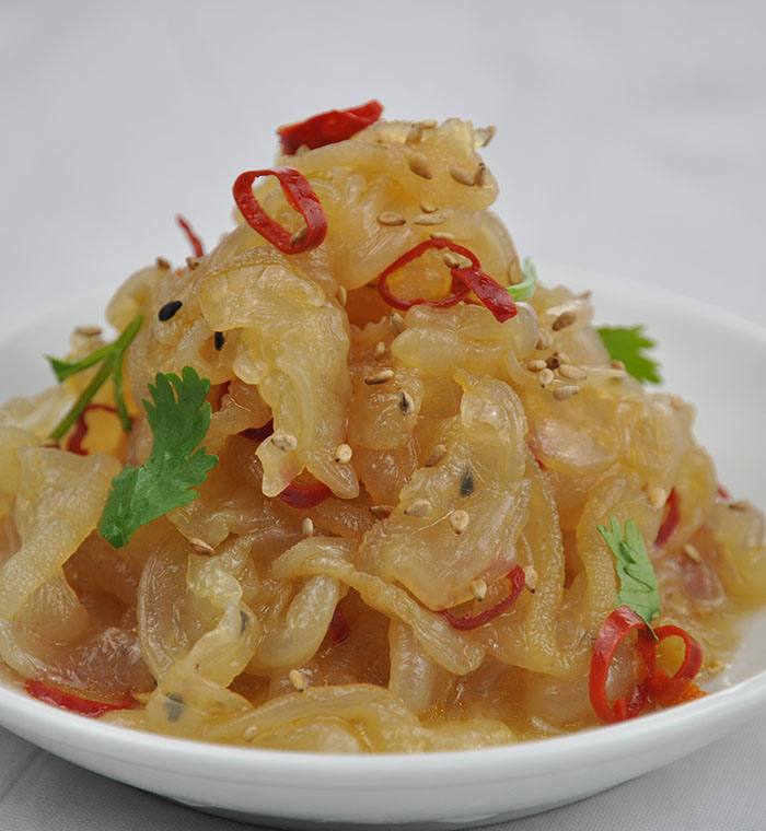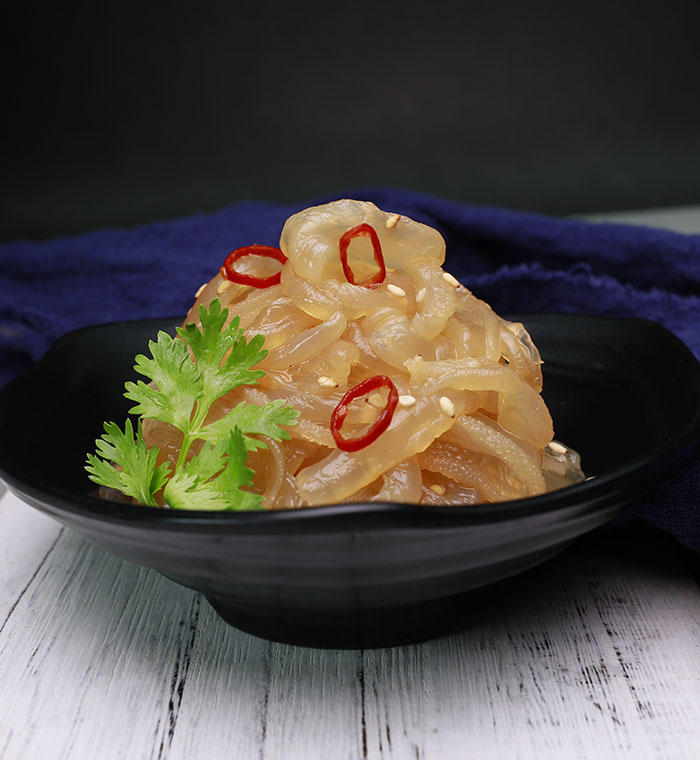 產品特點:精選優(yōu)質海蜇,色澤清麗、晶瑩剔透,Q彈有嚼勁、清香酸甜好味道