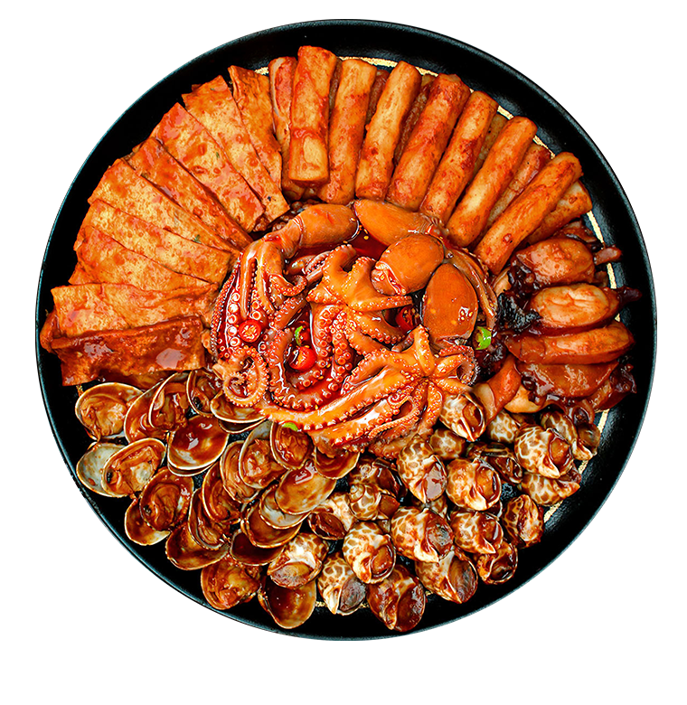 韓式炒年糕(速凍面米食品)、魚餅(速凍肉糜類制品)、韓式甜辣醬(復合調味料)、蛤肉、花螺、魷魚足片、小章魚、蝦