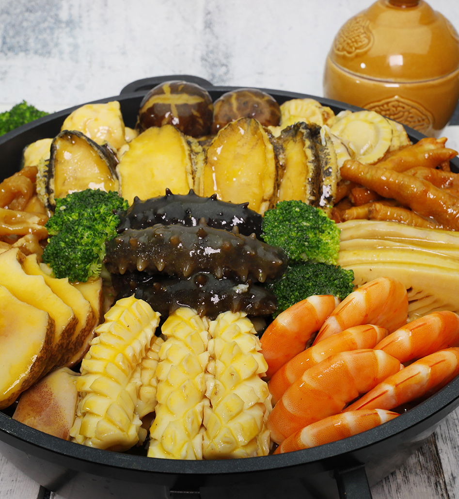 海參、鮑魚、蝦夷貝、魷魚、鱈魚丸、豬蹄筋、雞爪、冬筍、花菇、鮑螺肉、蝦仁、魚唇、西蘭花、雞高湯(母雞、飲用水、豬骨)、鹽、花雕酒。
